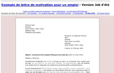Ces devrait jamais être négligé ou bien un 'qualifié essaye exemple lettre de motivation job d'été 'sera probablement un illusion. Voici un exemple de lettre de candidature pour postuler à un emploi de vendeuse ainsi que quelques conseils. Objet : candidature à un emploi d'été de vendeuse.