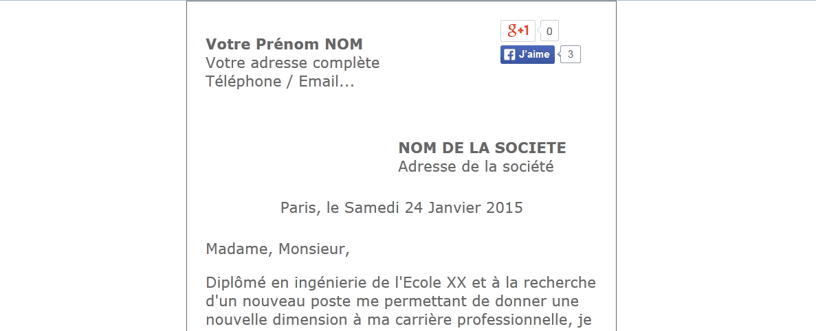 A l'attention de Mme (ou M…) Responsable RH à… Objet: Candidature au poste de [XXX] Madame [ou Monsieur], Ayant très récemment obtenu mon diplôme de [licence, master, etc] en [spécialité] à [université, école], j'ai acquis, au cours de ma formation, les compétences et.